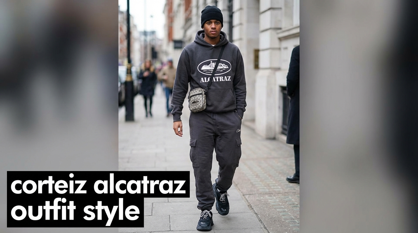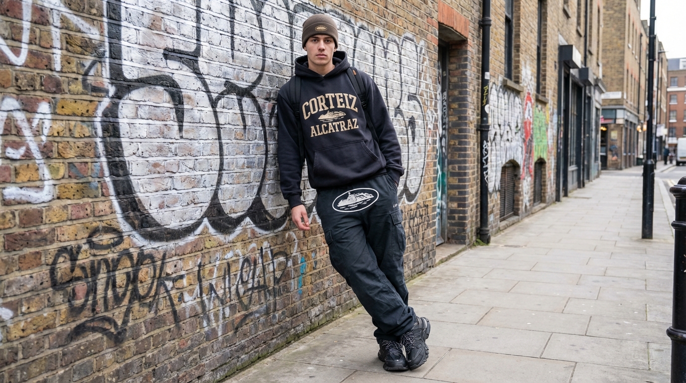 Wear an Alcatraz logo hoodie as the middle layer. Plain tee underneath first. Then the hoodie on top. Then a Corteiz Bolo jacket or heavier overcoat over everything to finish.