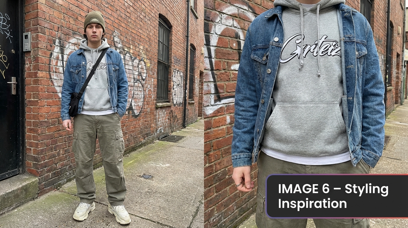 Finish the look with simple white or black sneakers like Nike Air Force 1s or New Balance 550s. These shoes go with almost any hoodie colour and make your outfit look clean and stylish.