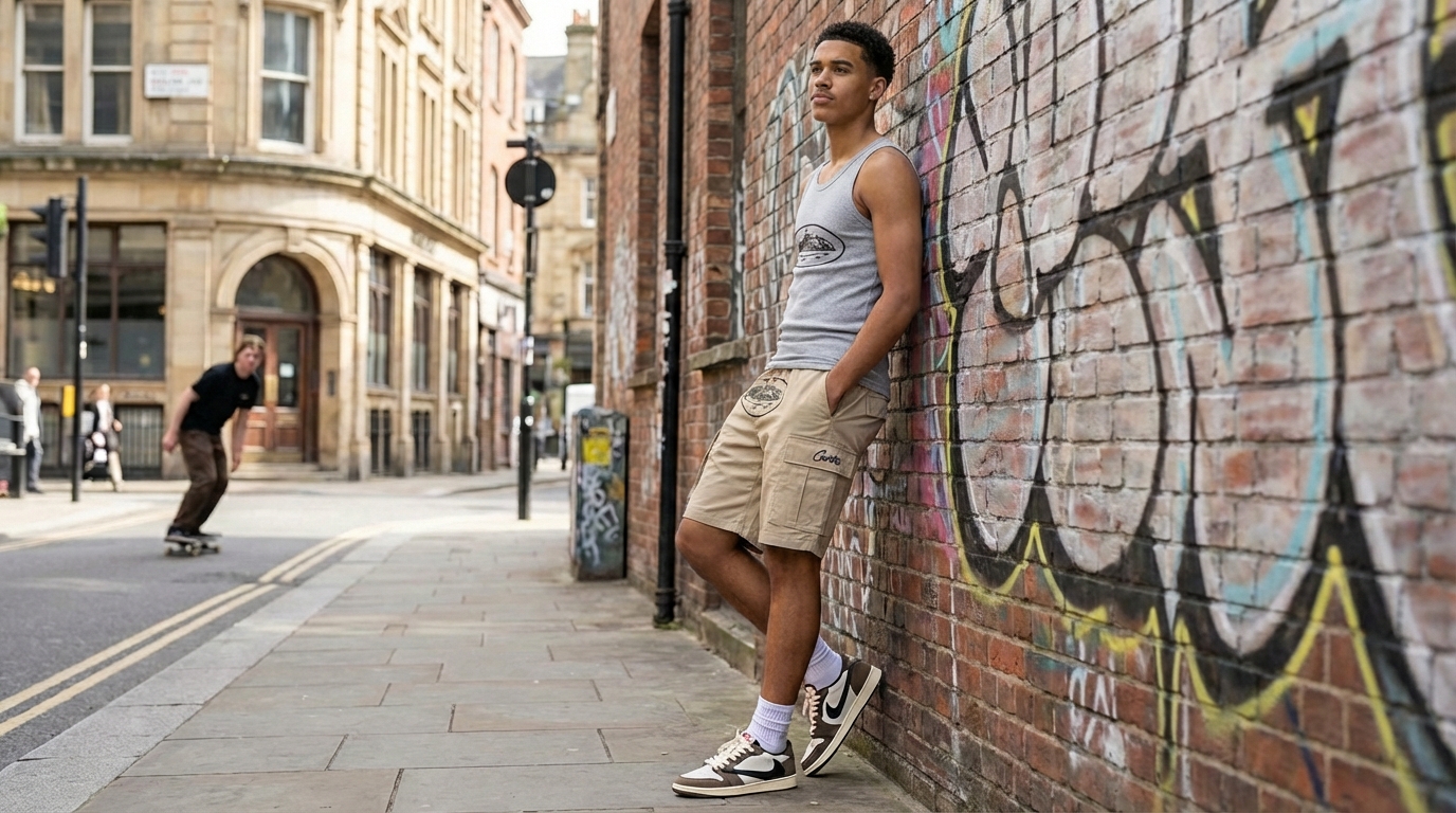 Summer is where the Corteiz Tank Top shines the most. Pair it with Corteiz Shorts for a full CRTZ fit that turns heads everywhere. Cargo shorts in olive or black work best. Keep the tank tucked out and relaxed. Add a fresh pair of Air Force 1s or Nike TNs on your feet.