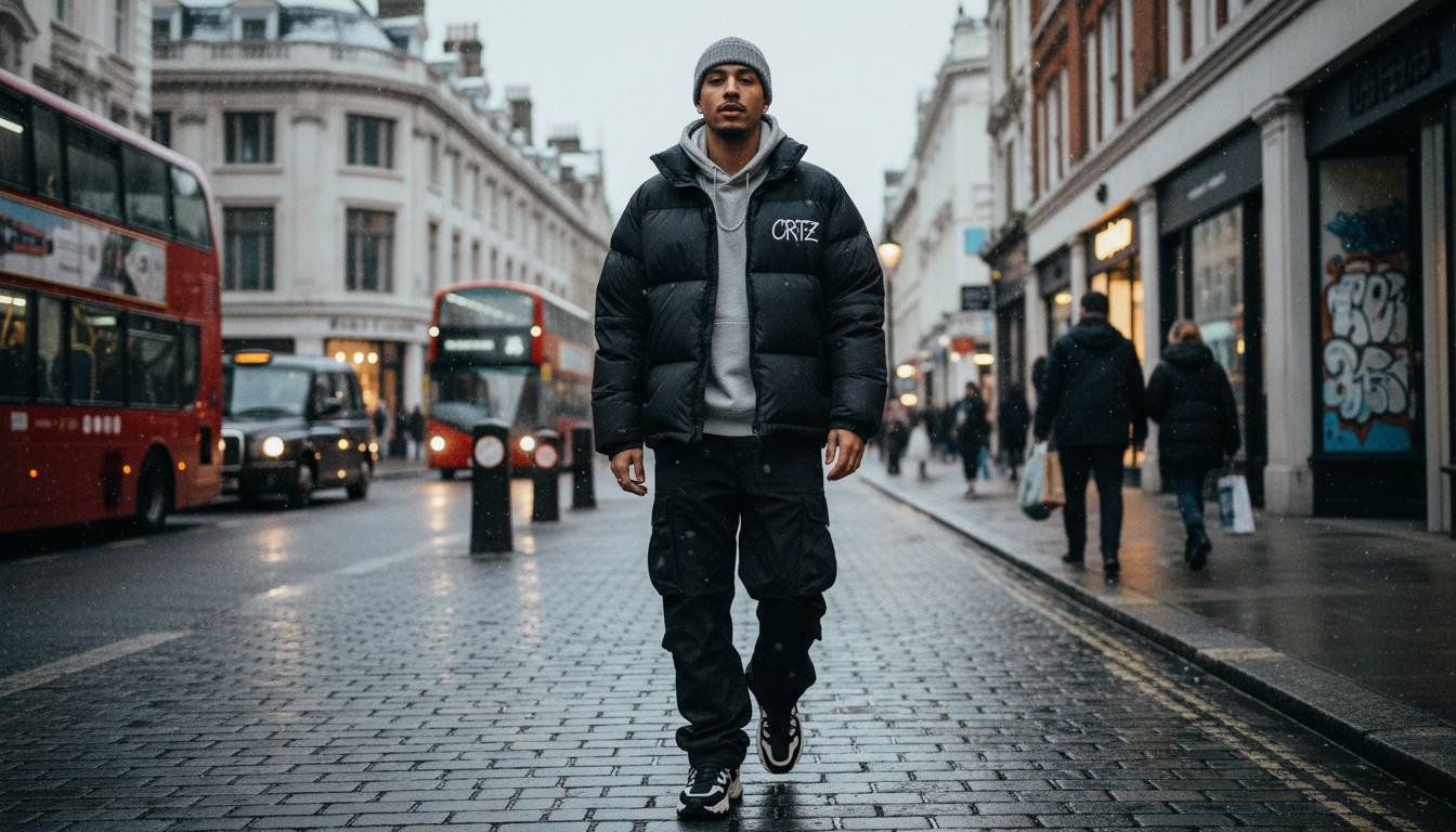 Put your puffer jacket on with cargo pants underneath. This creates the classic streetwear winter look that always works perfectly. Corteiz cargos with a Corteiz puffer make a complete matching set. The full brand outfit shows you really understand streetwear culture properly.