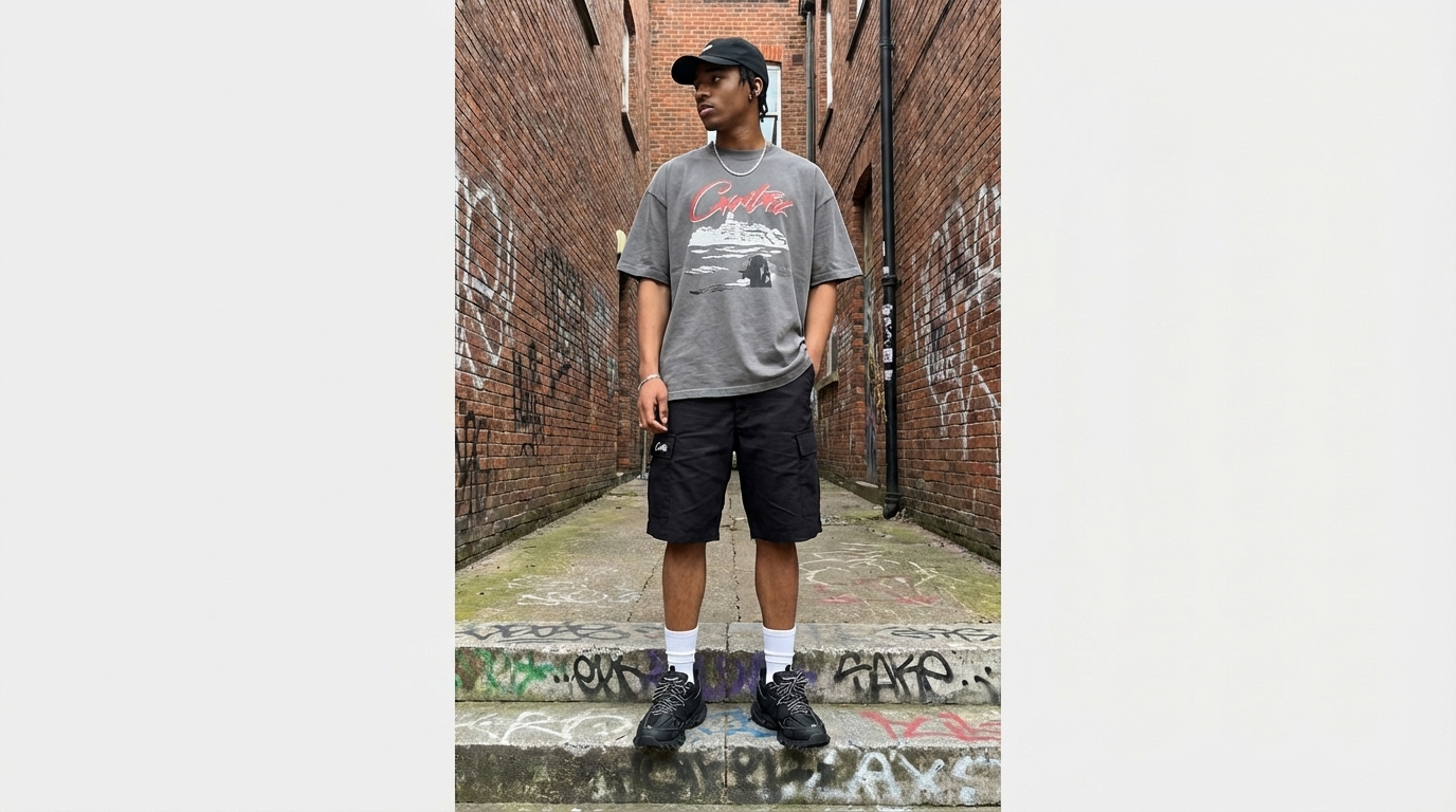 When it is warm, the formula simplifies further. A plain heavyweight tee tucked or half tucked, Short Corteiz shorts, and a Corteiz Trucker Hat on top is all you need. Choose a tee colour that picks up something already in the shorts,